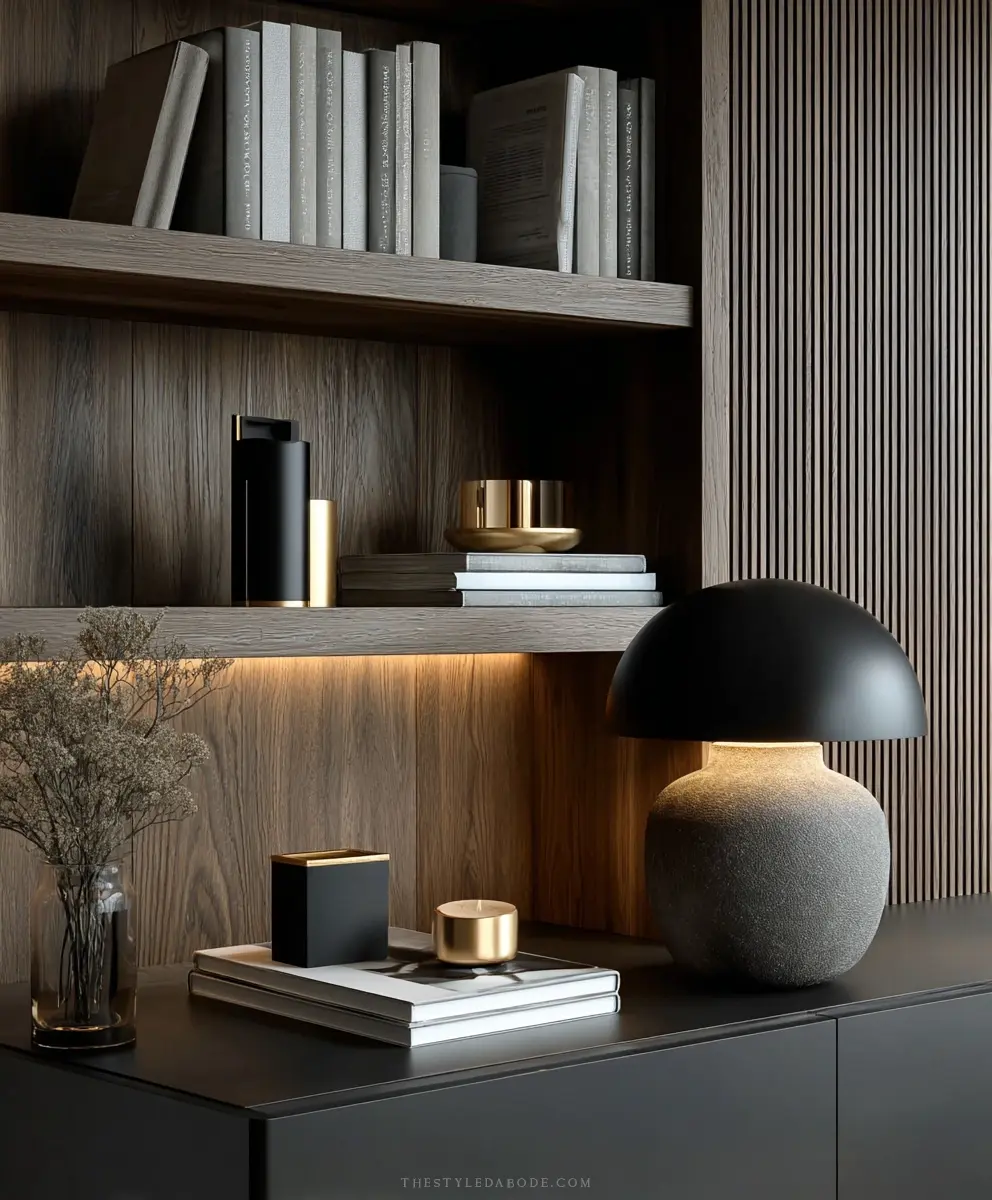 Warm wood tones and natural textures shape this serene workspace, where clean lines and quiet details invite focus. Thoughtfully arranged shelf decor and layered materials bring depth to the simple palette, which create a calm and naturally refined environment.