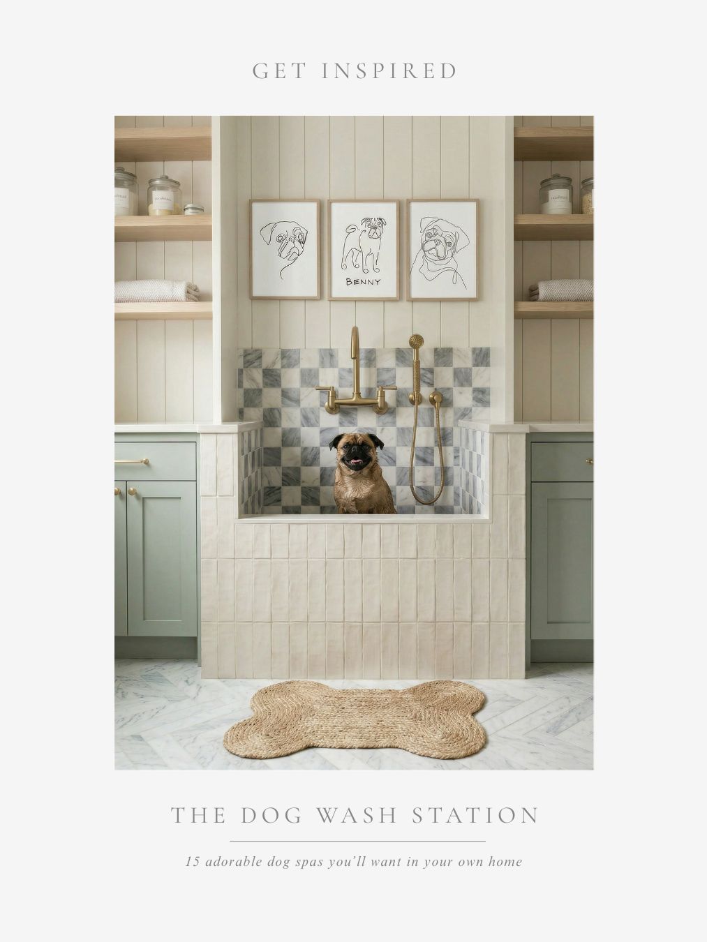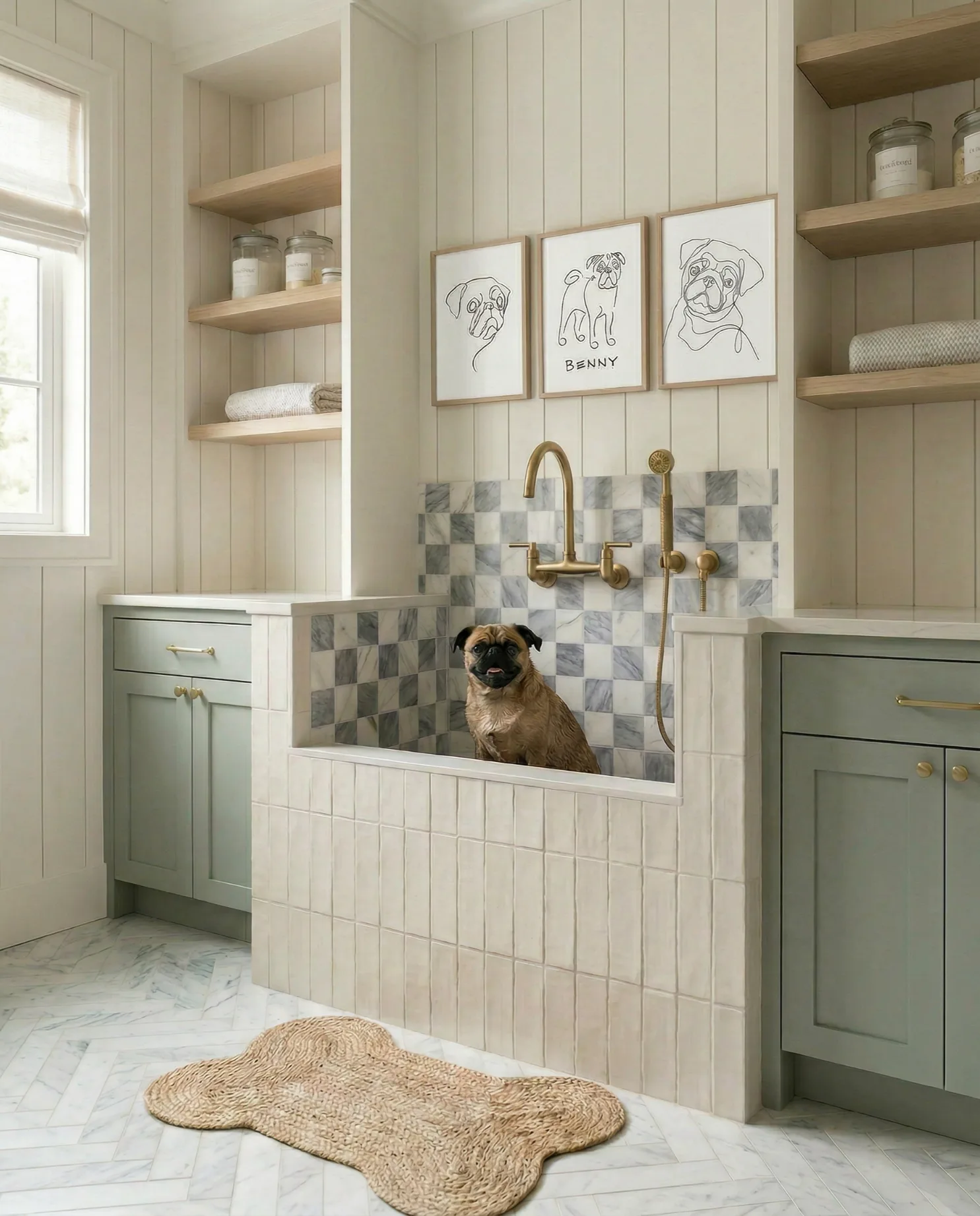 No 01 | Soft Sage Cabinet Dog Wash with Marble Checker Tile