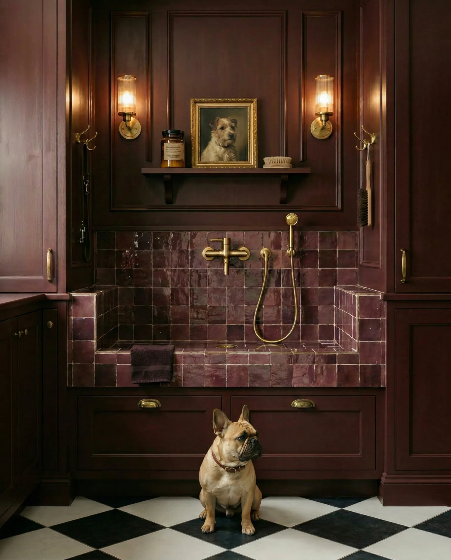 A richly layered dog wash that feels more like a private grooming room than a typical mudroom feature. Deep burgundy tile, dark wood paneling, and warm brass fixtures create a dramatic, almost library-like atmosphere that makes the space feel unexpectedly refined.