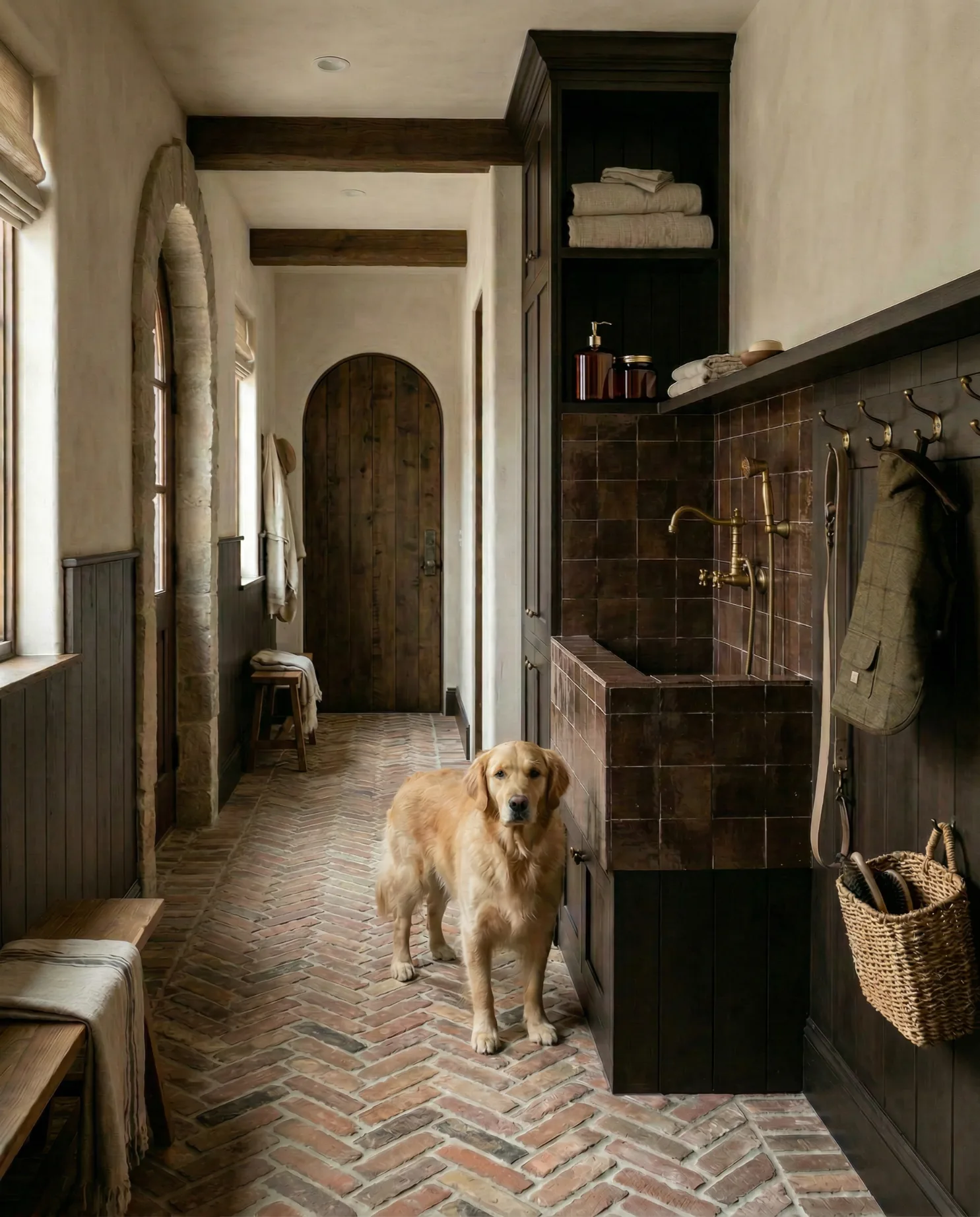 A long, narrow mudroom takes on a warm European character with brick flooring, dark wood cabinetry, and plaster walls. Tucked along the side, the built-in dog wash blends seamlessly into the architecture, proving that even the most practical spaces can feel beautifully considered.