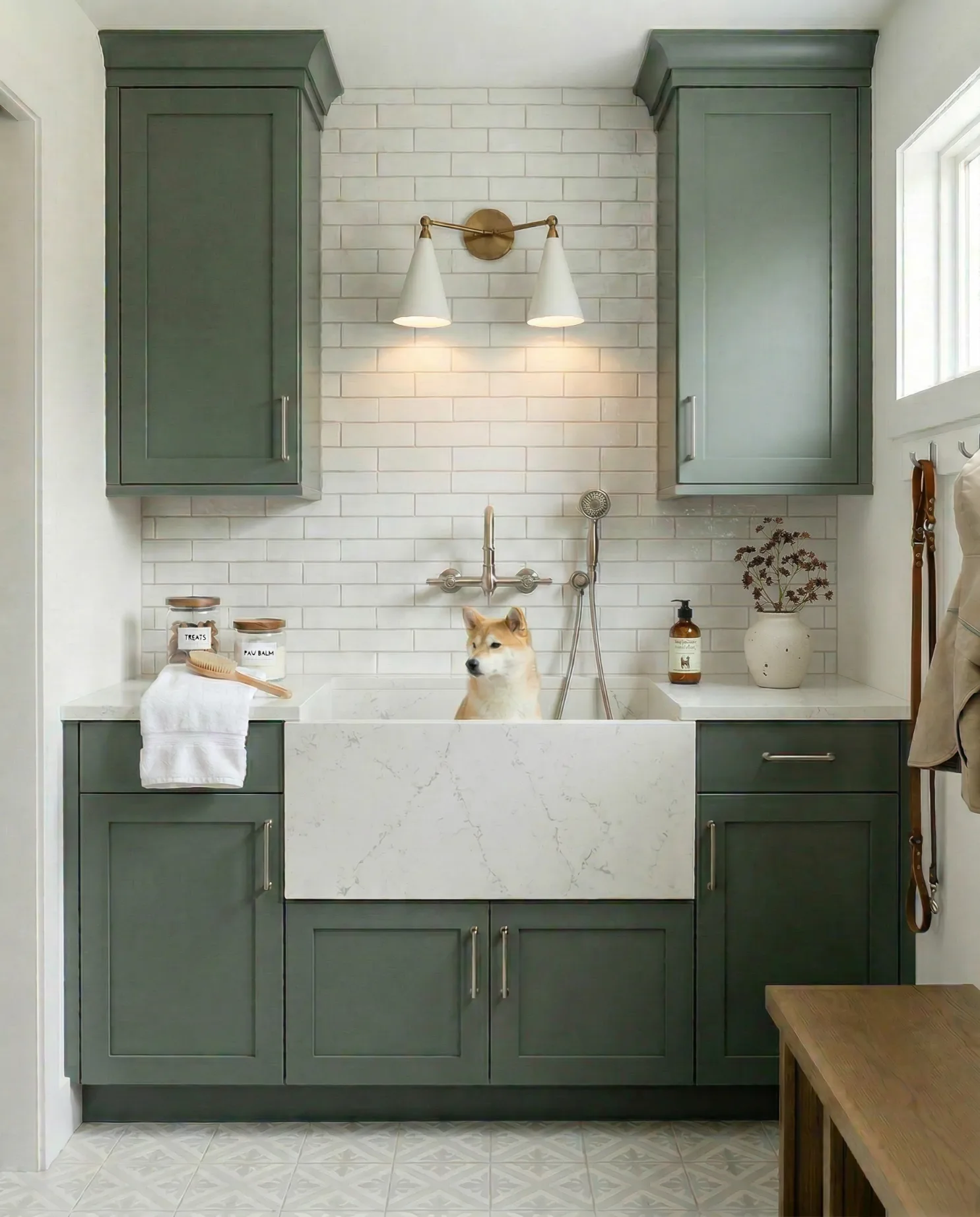 Glossy green tile wraps this compact dog wash, creating a small but beautifully defined nook beside the window. A warm brass pendant overhead and simple cabinetry keep the space feeling calm and tailored while giving one lucky pup a proper place to rinse off. Design Light House Co